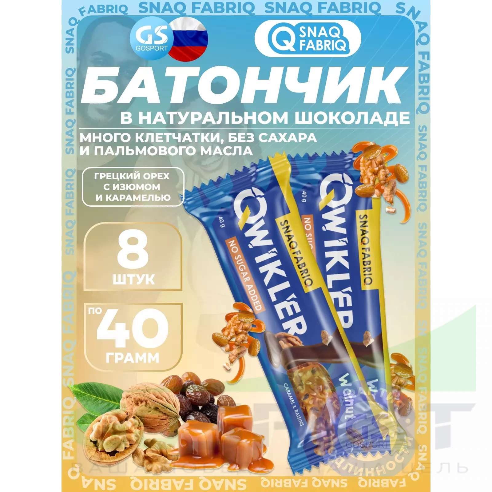 SNAQ FABRIQ QWIKLER (Квиклер) без сахара 8 x 40 г, Грецкий орех с изюмом и карамелью