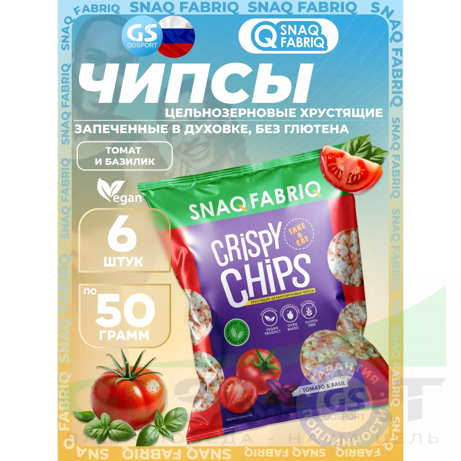 SNAQ FABRIQ Crispy Chips хрустящие цельнозерновые чипсы 6 x 50 г, Томат и базилик — Запеченные в духовке, без глютена