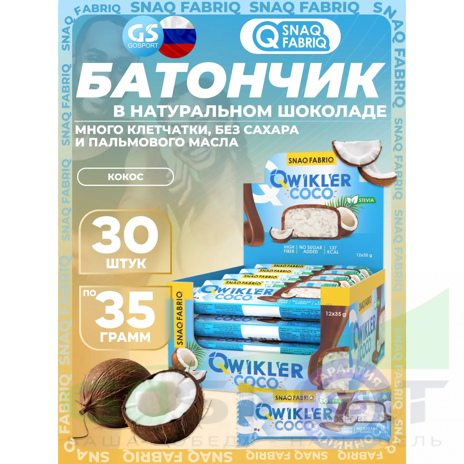 SNAQ FABRIQ Шоколадный батончик без сахара "QWIKLER" (Квиклер) 30 x 35 г, Кокос — Полезный перекус и поддержка диеты