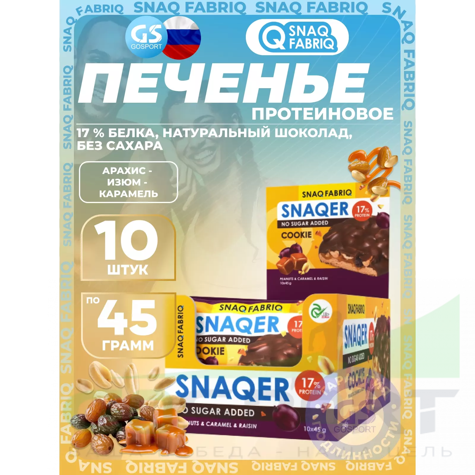SNAQ FABRIQ Печенье SNAQER 10 x 45 г, Арахис - изюм - карамель — Полезный и питательный перекус