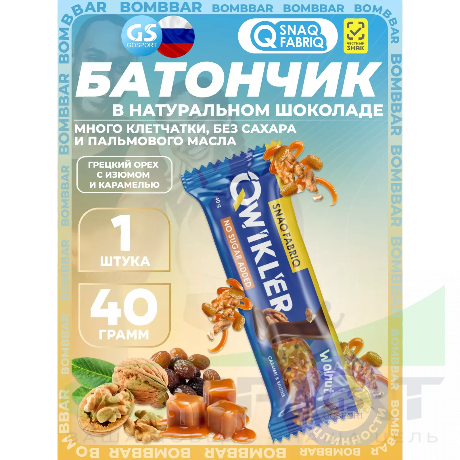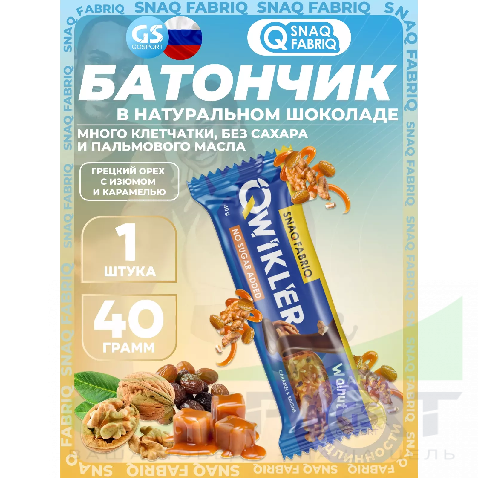 SNAQ FABRIQ QWIKLER (Квиклер) без сахара 40 г, Грецкий орех с изюмом и карамелью