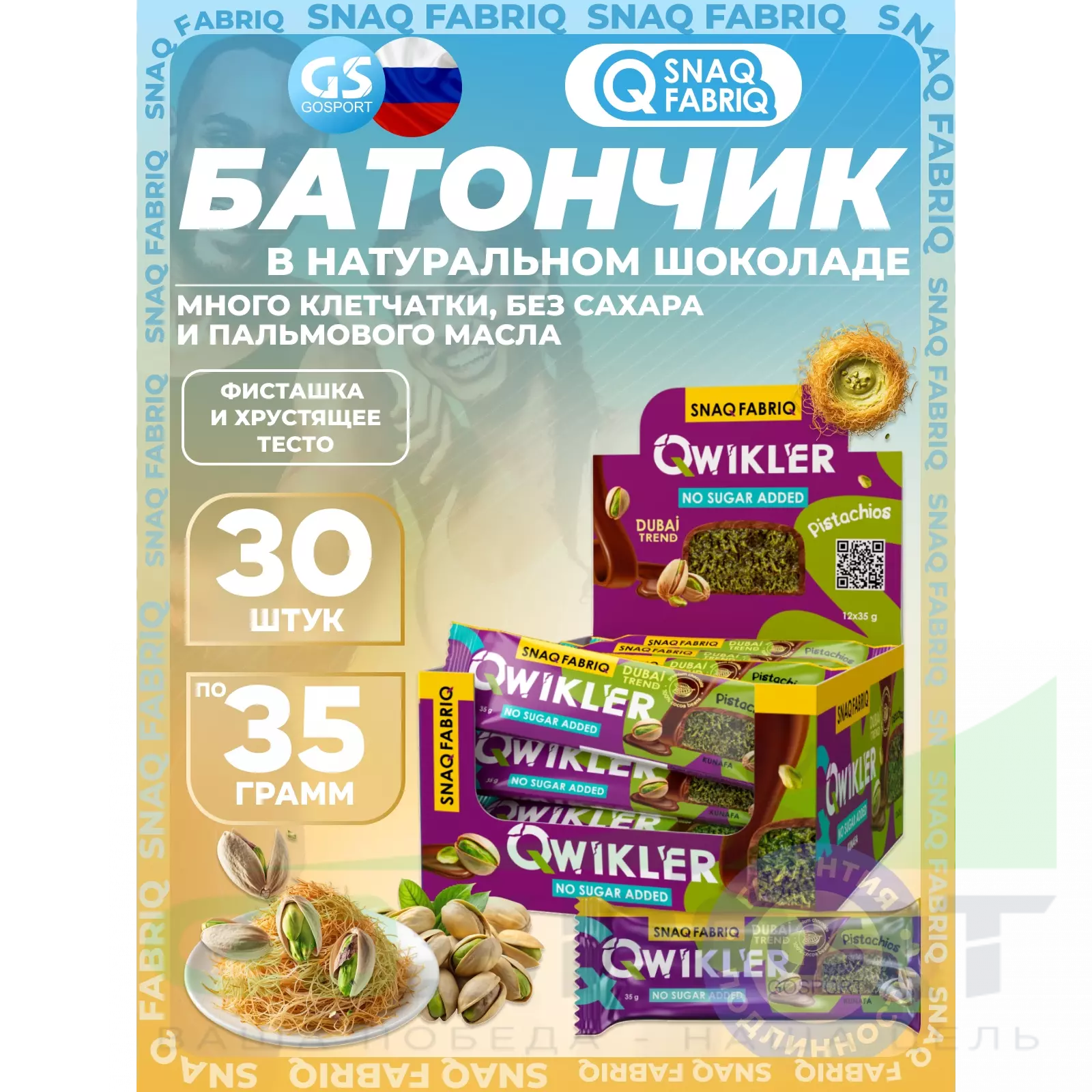 SNAQ FABRIQ QWIKLER (Квиклер) без сахара 30 x 35 г, Фисташка и хрустящее тесто — Полезный перекус и поддержка диеты
