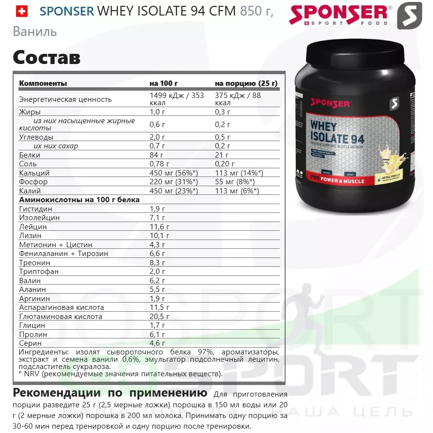 Состав SPONSER WHEY ISOLATE 94 CFM