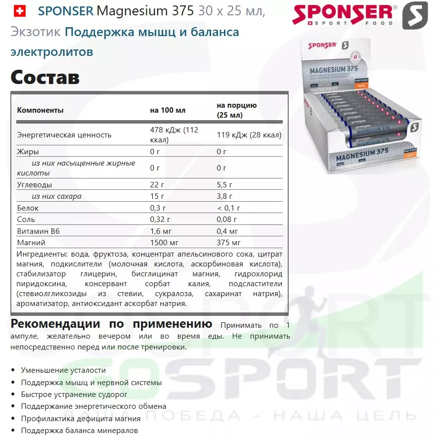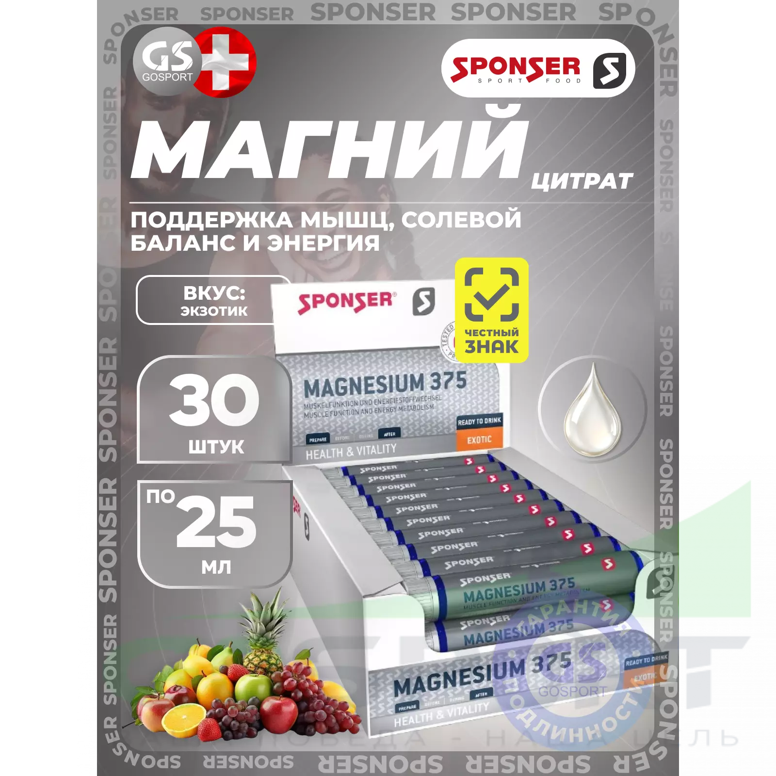 SPONSER Magnesium 375 экзотик - ампулы с высоким содержанием магния 375мг и витаминами, со вкусом экзотик. Эти три компонента способствуют уменьшению усталости и истощения, поддерживают функции мышц, баланс электролитов и энергетический метаболизм.