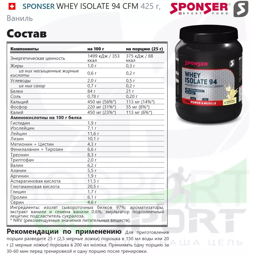 Состав SPONSER WHEY ISOLATE 94 CFM