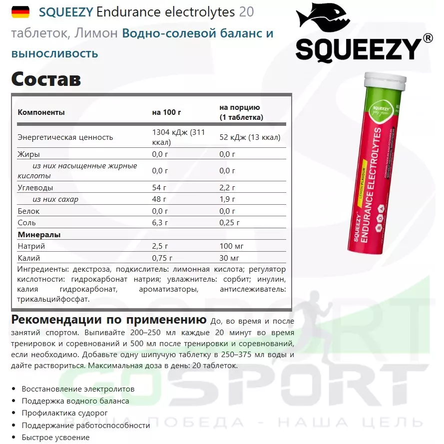SQUEEZY Endurance electrolytes 20 таблеток, Лимон — Водно-солевой баланс и выносливость