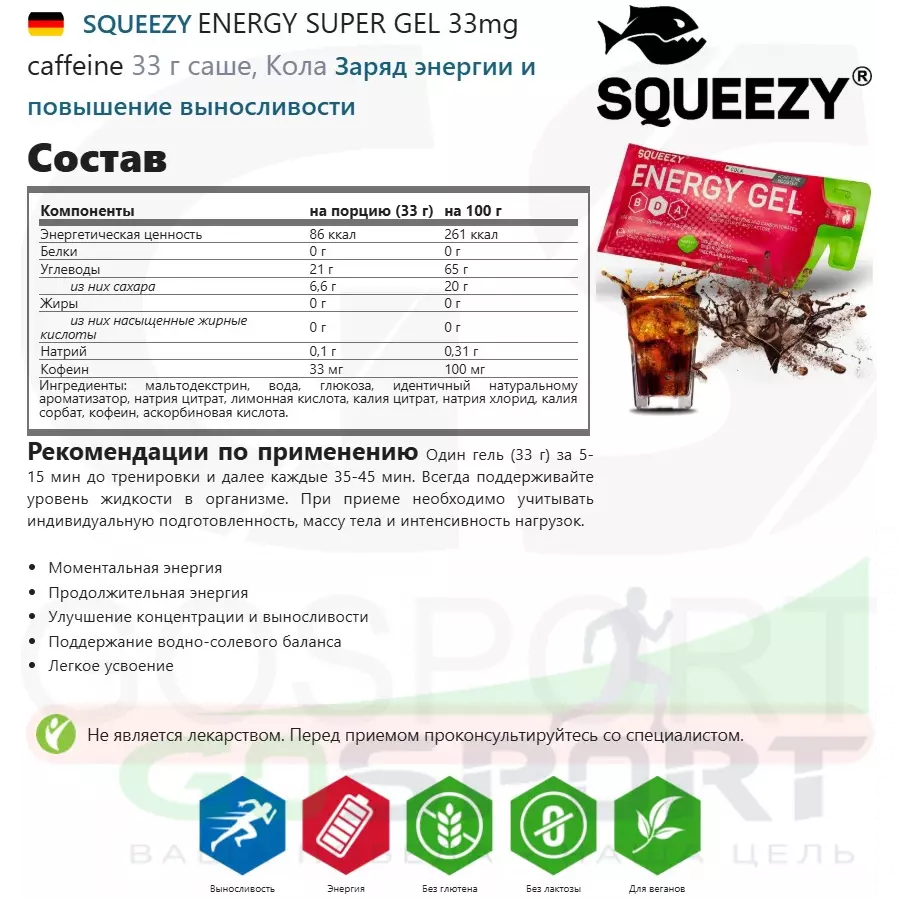 SQUEEZY ENERGY SUPER GEL 33mg caffeine 33 г саше, Кола — Заряд энергии и повышение выносливости