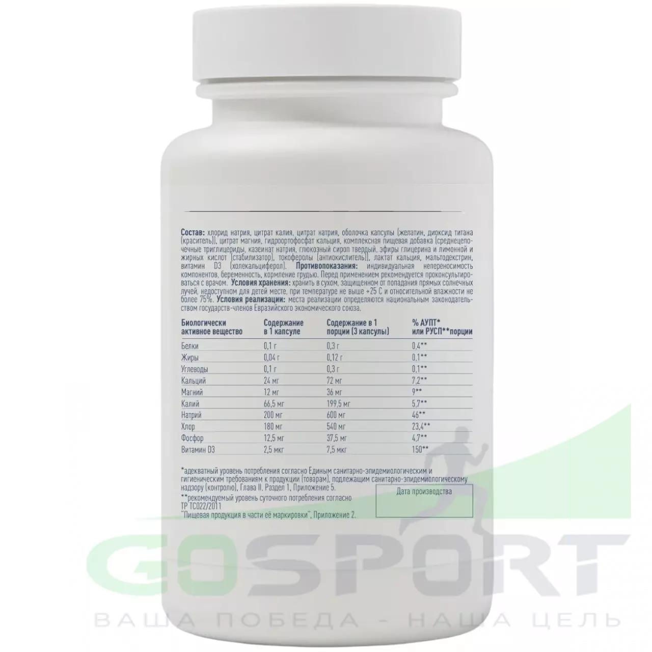 Ингредиенты: хлорид натрия, цитрат калия, цитрат натрия, оболочка капсулы (желатин, диоксид титана (краситель)), цитрат магния, гидроортофосфат кальция, комплексная пищевая добавка (среднецепочечные триглицериды. знат натрия, глюкозный сироп твердый, эфиры глицерина и лимонной и жирных кислот (стабилизатор), токоферолы (антиокислитель)), лактат кальция, мальтодекстрин, витамин D3 (холекальциферол).