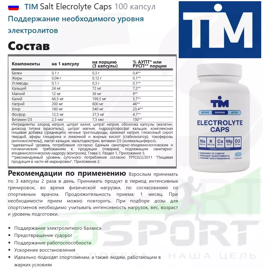 TIM Salt Elecrolyte Caps 100 капсул — Поддержание необходимого уровня электролитов