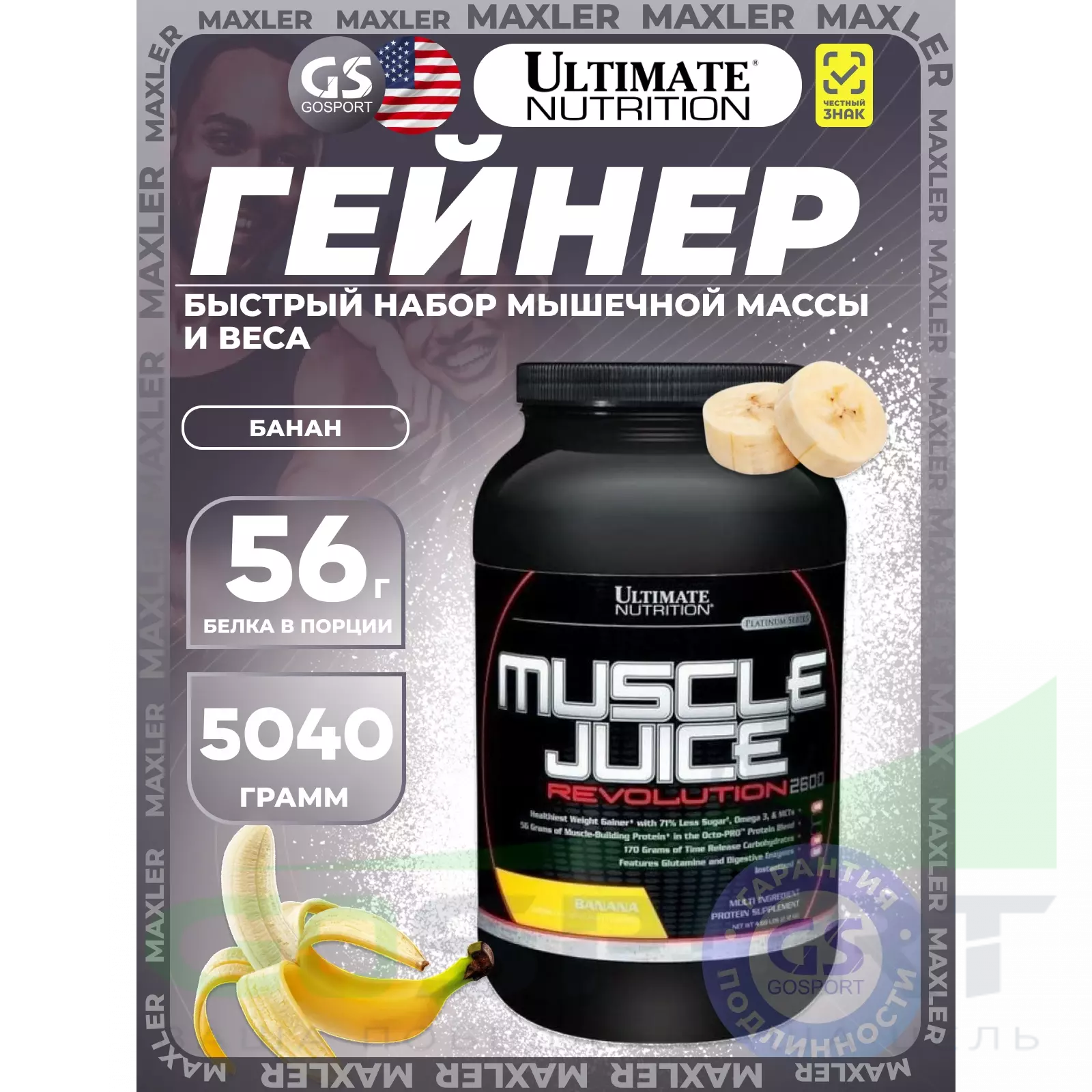 Muscle Juice Revolution – это новый продукт от компании Ultimate Nutrition в категории питания для набора массы. Эго отличие от других продуктов заключается в содержании 56 граммов белка (из расчета на одну порцию) в уникальной Octo-PRO™ протеиновой смеси. Приставка «Octo» говорит о содержании в данной смеси 8ми!!! различных протеинов, включая: концентрат сывороточного белка, изолят сывороточного белка, изолят молочного белка, гидролизат сывороточного белка, изолят яичного белка, мицеллярный казеин, концентрат молочного белка, казеинат кальция. Кроме того, для сведения к минимуму риска вздутия живота в процессе переваривания углеводов в Muscle Juice Revolution 2600 добавлено 175 грамм долго-усваиваемых углеводов. На этом новшества в данном продукте не заканчиваются: в формулу Muscle Juice Revolution 2600 вместо обычного глютамина входит 1000 мг глютаминовой смеси с добавлением L-аланил-L-глютамин – мощного дипептида, способного защитить от катаболизма мышечных тканей, а также снабдить ваши мышцы необходимым топливом в периоды продолжительных тренировок. Принимая по две порции в течения дня, ваш организм получает более 2600 калорий и более 146 граммов белка, приближая вас к заветной цели по набору массы.