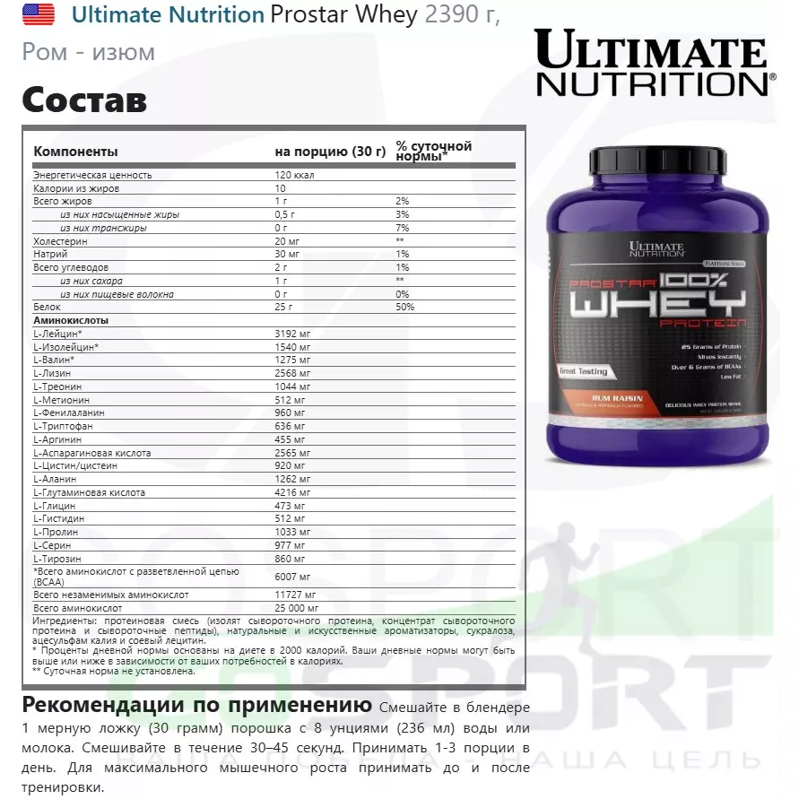 Для удовлетворения потребностей спортсменов компания Ultimate Nutrition разработала продукт 100% Prostar Whey Protein с содержанием всего перечня заменимых и незаменимых аминокислот, необходимых для строительства вашей мускулатуры как при длительных, так и непродолжительных интенсивных нагрузках. 100% Prostar Whey Protein – это уникальное сочетание всех питательных веществ, включая фактор иммунного роста, получаемый с использованием специальных процессов из сывороточного белка. Поскольку упражнения могут нанести урон вашей иммунной систем, 100% Prostar Whey Protein выбор тех, кто придерживается активного образа жизни, независимо являетесь ли вы любителем или профессионалом.