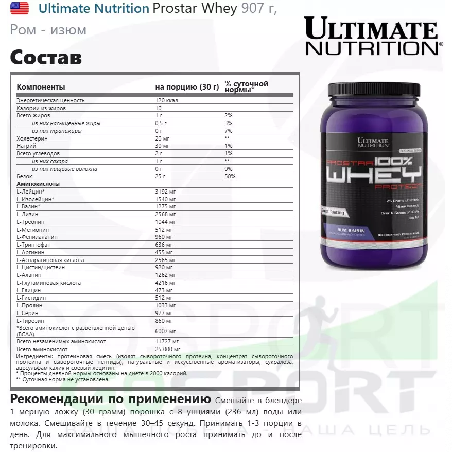 Для удовлетворения потребностей спортсменов компания Ultimate Nutrition разработала продукт 100% Prostar Whey Protein с содержанием всего перечня заменимых и незаменимых аминокислот, необходимых для строительства вашей мускулатуры как при длительных, так и непродолжительных интенсивных нагрузках. 100% Prostar Whey Protein – это уникальное сочетание всех питательных веществ, включая фактор иммунного роста, получаемый с использованием специальных процессов из сывороточного белка. Поскольку упражнения могут нанести урон вашей иммунной систем, 100% Prostar Whey Protein выбор тех, кто придерживается активного образа жизни, независимо являетесь ли вы любителем или профессионалом.