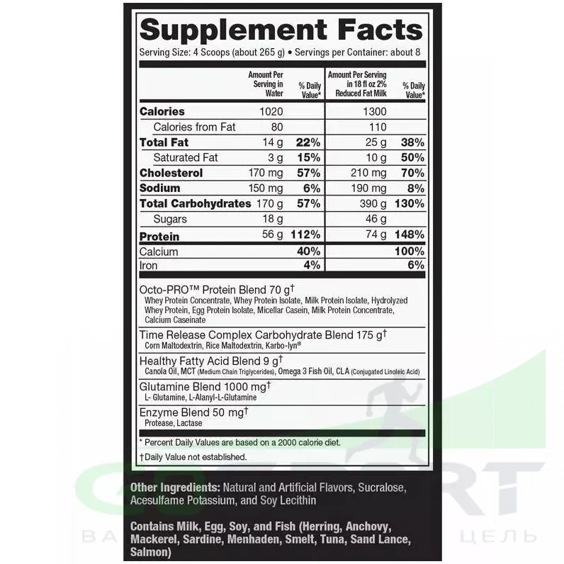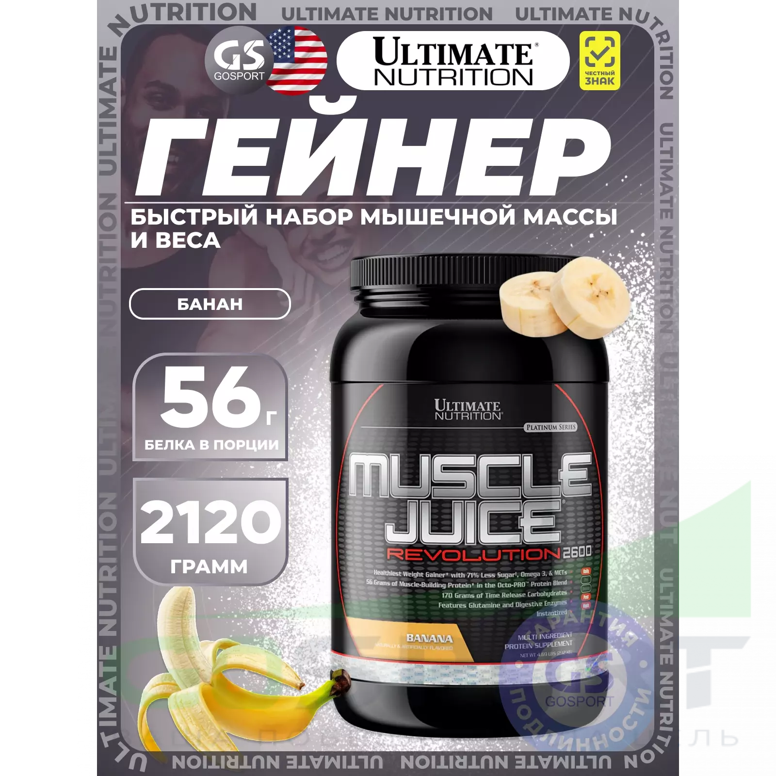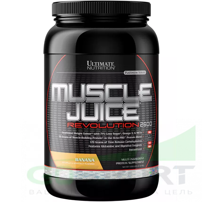 Muscle Juice Revolution – это новый продукт от компании Ultimate Nutrition в категории питания для набора массы. Эго отличие от других продуктов заключается в содержании 56 граммов белка (из расчета на одну порцию) в уникальной Octo-PRO™ протеиновой смеси. Приставка «Octo» говорит о содержании в данной смеси 8ми!!! различных протеинов, включая: концентрат сывороточного белка, изолят сывороточного белка, изолят молочного белка, гидролизат сывороточного белка, изолят яичного белка, мицеллярный казеин, концентрат молочного белка, казеинат кальция. Кроме того, для сведения к минимуму риска вздутия живота в процессе переваривания углеводов в Muscle Juice Revolution 2600 добавлено 175 грамм долго-усваиваемых углеводов. На этом новшества в данном продукте не заканчиваются: в формулу Muscle Juice Revolution 2600 вместо обычного глютамина входит 1000 мг глютаминовой смеси с добавлением L-аланил-L-глютамин – мощного дипептида, способного защитить от катаболизма мышечных тканей, а также снабдить ваши мышцы необходимым топливом в периоды продолжительных тренировок. Принимая по две порции в течения дня, ваш организм получает более 2600 калорий и более 146 граммов белка, приближая вас к заветной цели по набору массы.
