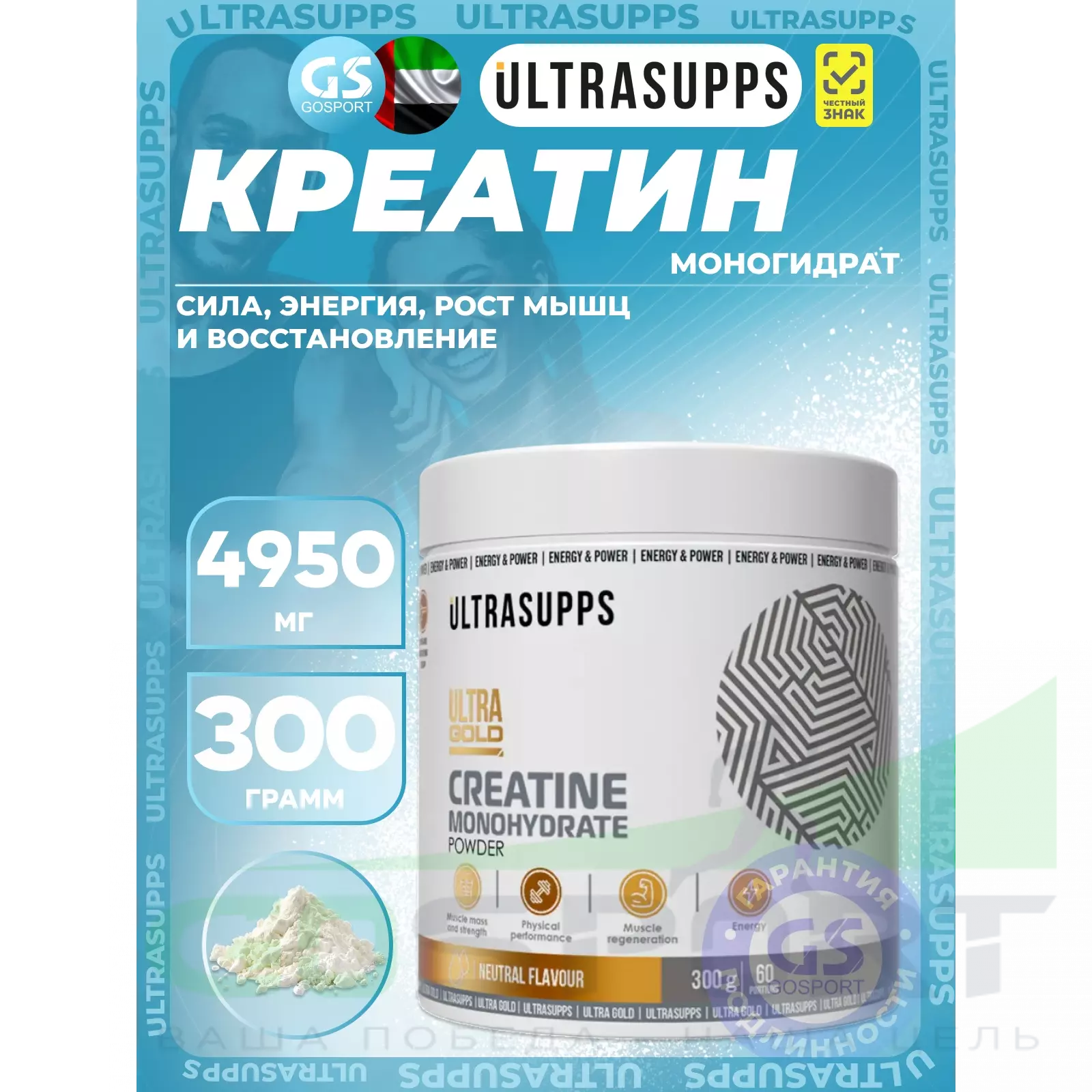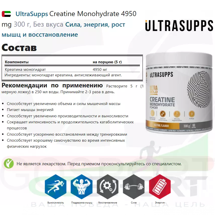 UltraSupps Creatine Monohydrate 4950 mg 300 г, Без вкуса — Сила, энергия, рост мышц и восстановление