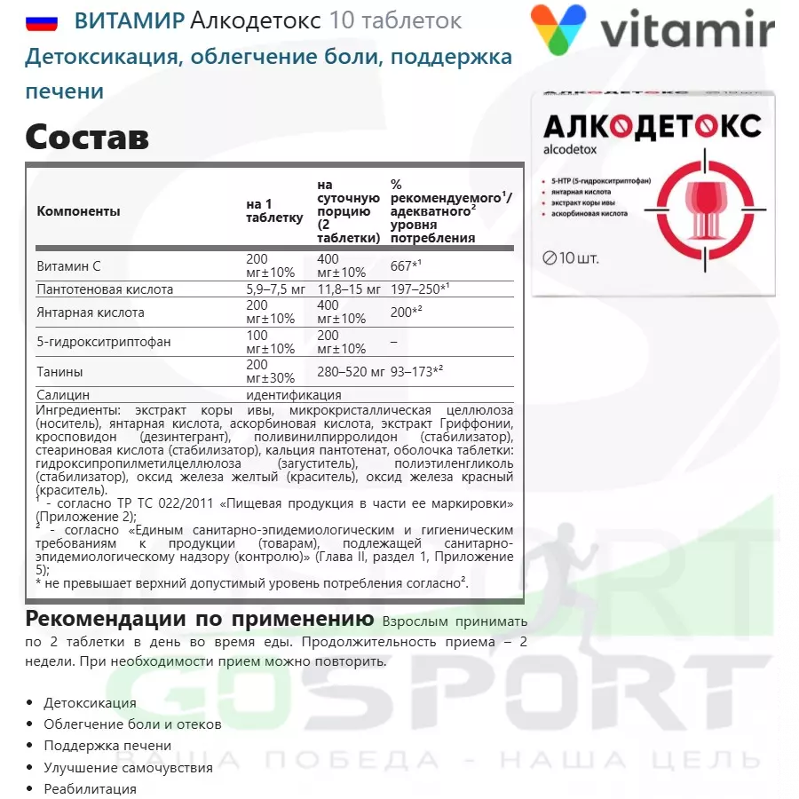 | Янтарная кислота | 200 мг±10% | 400 мг±10% | 200*² |