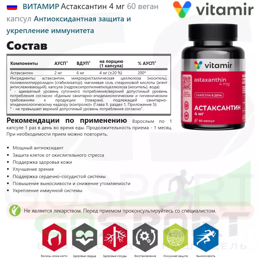 ВИТАМИР Астаксантин 4 мг 60 веган капсул — Антиоксидантная защита и укрепление иммунитета