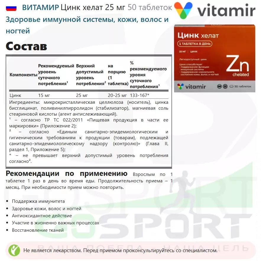 Описание ВИТАМИР Цинк хелат 25 мг
