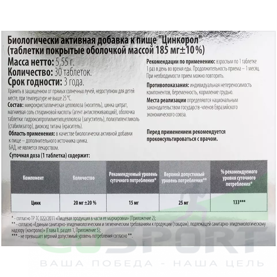 Лицензии и сертификаты Цинкорол 20 мг 30 таблеток