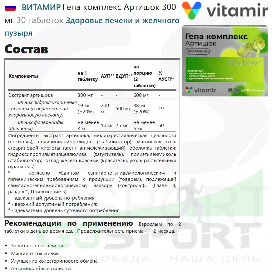 Состав ВИТАМИР Гепа комплекс Артишок 300 мг