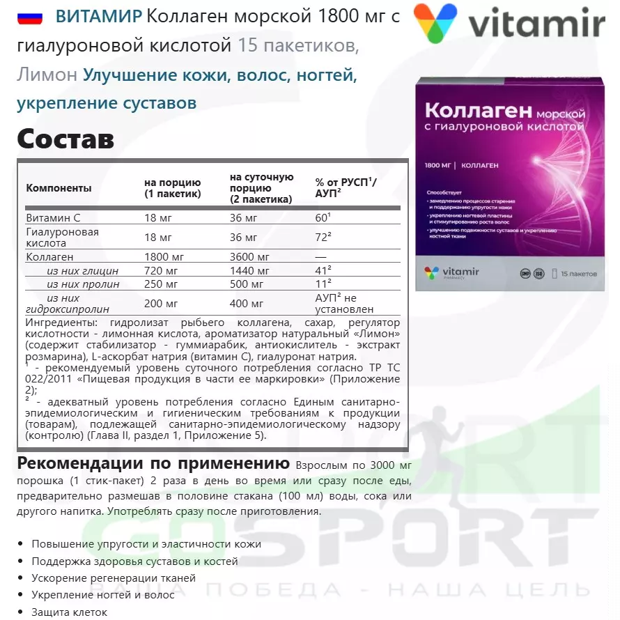 Состав ВИТАМИР Коллаген морской 1800 мг с гиалуроновой кислотой