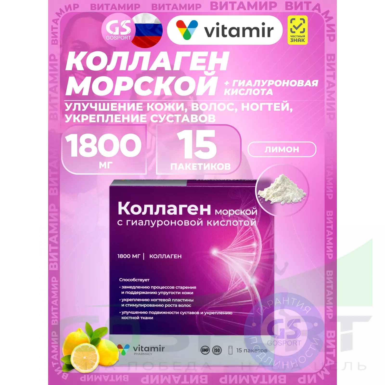 ВИТАМИР Коллаген морской 1800 мг с гиалуроновой кислотой 15 пакетиков, Лимон — Улучшение кожи, волос, ногтей, укрепление суставов