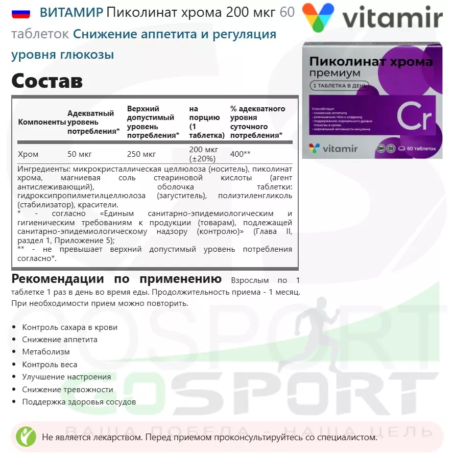 Состав ВИТАМИР Пиколинат хрома 200 мкг