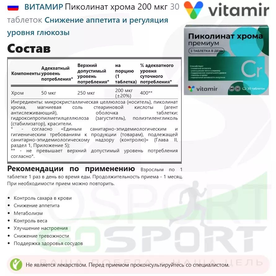 Состав ВИТАМИР Пиколинат хрома 200 мкг