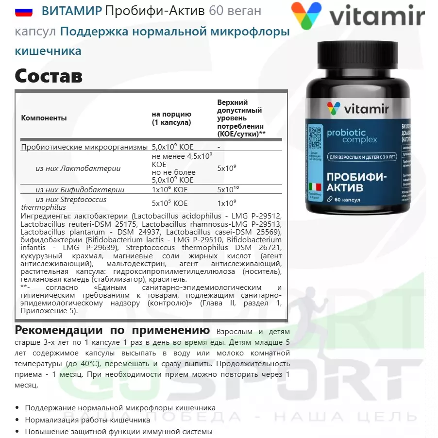 Ингредиенты: лактобактерии (Lactobacillus acidophilus - LMG P-29512, Lactobacillus reuteri-DSM 25175, Lactobacillus rhamnosus-LMG Р-29513, Lactobacillus plantarum - DSM 24937, Lactobacillus casei-DSM 25569), бифидобактерии (Bifidobacterium lactis - LMG P-29510, Bifidobacterium infantis - LMG P-29639), Streptococcus thermophilus DSM 26721, кукурузный крахмал, магниевые соли жирных кислот (агент антислеживающий), мальтодекстрин, агент антислеживающий, растительная капсула: гидроксипропилметилцеллюлоза (носитель), геллановая камедь (стабилизатор), краситель.