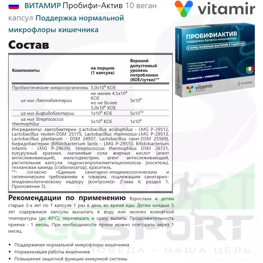 Ингредиенты: лактобактерии (Lactobacillus acidophilus - LMG P-29512, Lactobacillus reuteri-DSM 25175, Lactobacillus rhamnosus-LMG Р-29513, Lactobacillus plantarum - DSM 24937, Lactobacillus casei-DSM 25569), бифидобактерии (Bifidobacterium lactis - LMG P-29510, Bifidobacterium infantis - LMG P-29639), Streptococcus thermophilus DSM 26721, кукурузный крахмал, магниевые соли жирных кислот (агент антислеживающий), мальтодекстрин, агент антислеживающий, растительная капсула: гидроксипропилметилцеллюлоза (носитель), геллановая камедь (стабилизатор), краситель.